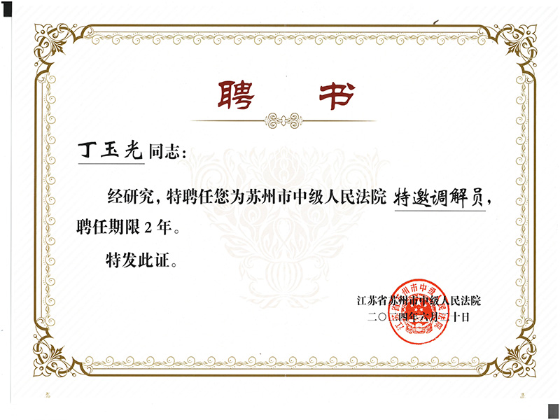 • 祝賀江蘇仁合中惠丁玉光同志受聘為蘇州市中級人民法院特邀調解員! 10-14